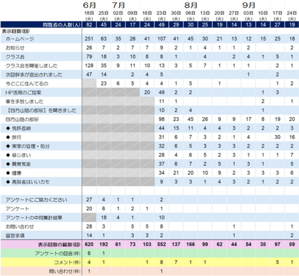 6月中旬にホームページ開設のご案内をお送りしてから3か月余りが経過しました。ここまでの閲覧状況を、週単位に各ページへのアクセス件数として集計し一表にまとめたのでご報告いたします。